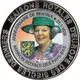 Multicolor portrait of Queen Beatrix with green hat within inner circle. |