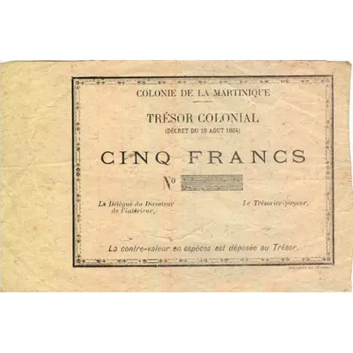 | Obverse lettering | COLONIE DE LA MARTINIQUE TRÉSOR COLONIAL (Décret du 18 Août 1884) CINQ FRANCS La contre-valeur en espéces est déposée au Trésor Imprimerie des Colonies (Translation: Colony of Martinique Colonial Treasury (Decree August 18, 1884) Five Francs The cash equivalent is deposited in the Treasury.) |