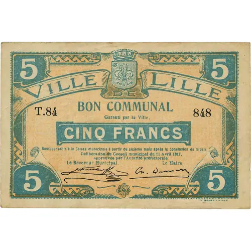 | Obverse lettering | 0.97 955 VILLE DE LILLE BON COMMUNAL Garanti par la ville CINQ FRANCS Remboursement a la Caisse municipal a partir du sixième mois après la conclusion de la paix Délibération du Conseil Municipal du 11 Avril 1917 , approuvé par M. le Préfet du Nord Le Receveur Municipal | Le Maire L DANEL à LILLE. |
