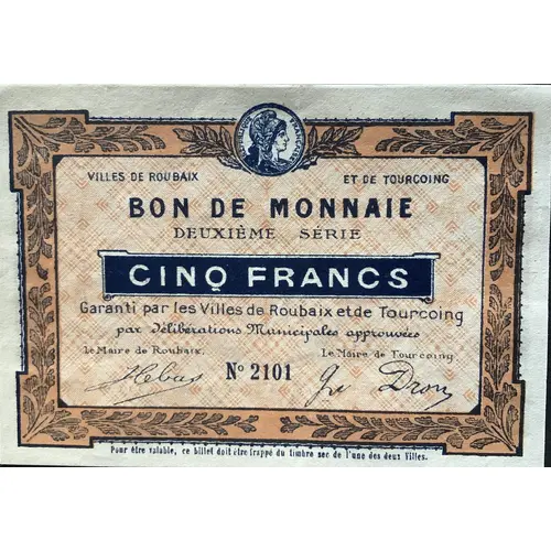 VILLES DE ROUBAIX ET DE TOURCOING BON DE MONNAIE Deuxième série CINQ FRANCS Garanti par les villes de Roubaix et de Tourcoing par délibérations Municipales approuvées LE MAIRE DE ROUBAIX. N°2101 LE MAIRE DE TOURCOING. Pour être valable, ce billet doit être frappé du timbre sec de l`une des deux Villes |
