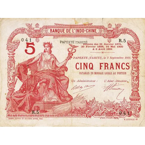 | Obverse lettering | BANQUE DE L`INDO-CHINE PAPEETE (TAHITI) Décrets des 21 Janvier 1875, 20 Février 1888, 16 Mai 1900 & 3 Avril 1901 PAPEETE (TAHITI), le 2 Septembre 1912. CINQ FRANCS PAYABLES EN MONNAIE LOCALE AU PORTEUR Un Administrateur : L`Admr-Directeur, DANIEL DUPUIS ET GEORGES DUVAL FEC A LEVEILLE SC (Translation: Bank of Indochina Papeete (Tahiti) Decrees of January 21, 1875 ; February 20, 1888 ; May 16, 1900 and April 3, 1901 Papeete (Tahiti), September 2nd., 1912. Five Francs payable in cash to bearer An administrator , The Director) |