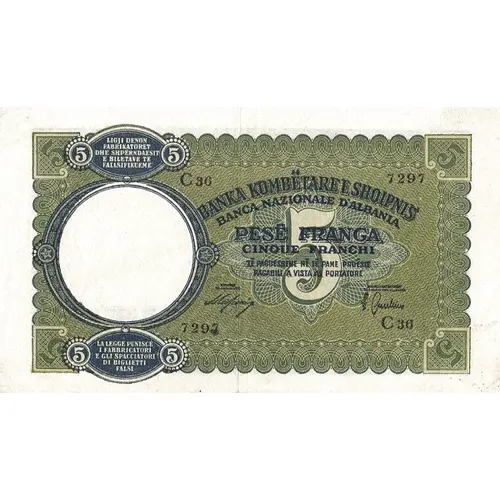 Obverse lettering 5 BANKA KOMBETARE E SHQIPNIS BANCA NAIONALE D`ALBANIA PESE FRANGA CINQUE FRANCHI
