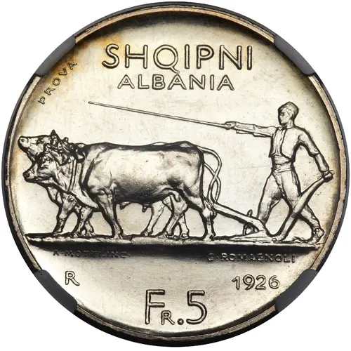 | Obverse lettering | SHQIPNI ALBANIA PROVA R 1926 FR.5 (Translation: Albania Trial) |