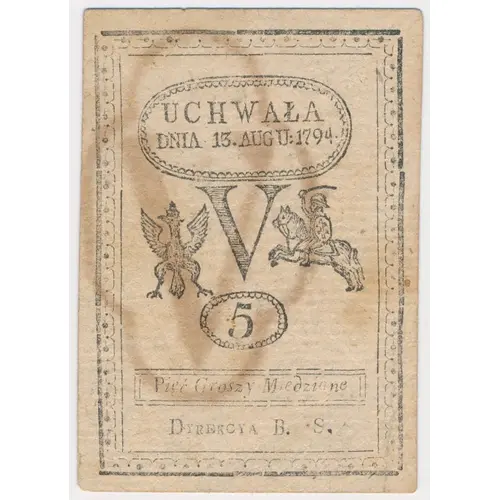UCHWAŁA DNIA 13 AUGU: 1794. V 5 Pięć Groszy Miedziane DYREKCYA B.S. (Translation: Resolution 13th August 1794 V 5 Five Copper Groszy Leadership [of] B.S.) |