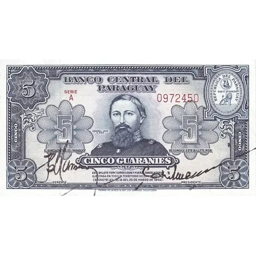| Obverse lettering | BANCO CENTRAL DEL PARAGUAY SERIE A EL BANCO CENTRALDEL PARAGUAY RECONOCE ESTE BILLETE POR CINCO GUARANIES ESTE BILLETE TIENE CURSO LEGAL Y FUERZA CANCELATORIA ILIMITADA EN TODO EL TERRITORIO DE LA REPUBLICA (DECRETO-LEI Nº 18 DEL 25 DE MARZO DE 1952). (Translation: Central Bank of Paraguay The Central Bank of Paraguay recognizes this banknote for Five Guaranies This banknote has legal course and unlimited cancellation force throughout the territory of the Republic (Decree-Law no.18 of March 25th., 1952).) |