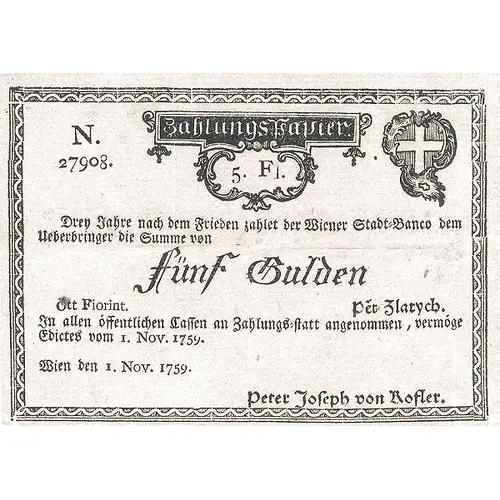 | Obverse lettering | ZahlungsPapier. 5. Fl. Drey Jahre nach dem Frieden zahltet der Wiener Stadt-Banco dem Ueberbringer die Summe von Fünf Gulden Ött Fiorint. Pét Zlatych. In allen öffentlichen Caſſen an Zalungs-ſtatt angenommen, vermoge Edictes vom 1. Nov. 1759. Wien den 1. Nov. 1759. Peter Joſeph von Roſler. |