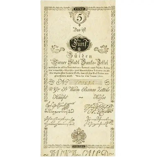 Obverse lettering FÜNF 5 Das iſt Fünf Gulden Wiener Stadt Banko-Zettel Welcher in allen Kontributions – Kameral – und Banco – Kaſſen der hungariſch – böhmiſch – und öeſterreichiſchen Erblanden in al- len Abgaben für Baares Geld, das iſt für Fünf Gulden an- genohmen wird. Wien den 1 ten Januar 1800 v. Gr. St. Wien Banco Zettels Haupt ~ Kaſse 5 Gülden ~ FÜNF ~ GULD ~