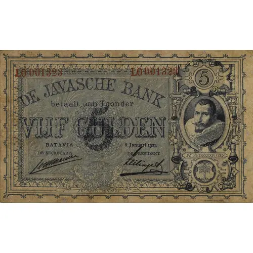DE JAVASHE BANK betaalt aan Tonder VIJF GULDEN BATAVIA 6 Januari 1921. JOH ENSCHEDÉ EN ZONEN (Translation: The Javanese Bank Pay to the Bearer Five Gulden Batavia January 6, 1921. Joh. Enschedé and Sons) |
