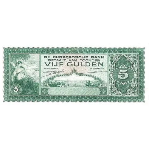 (Translation: The Curaçao Bank pay to Bearer Five Gulden)