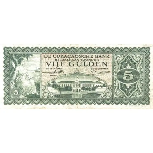 | Popis líce | Green on red underprint. Woman seated with scroll and flag at left; view of Fort Amsterdam in Curaçao at center. |