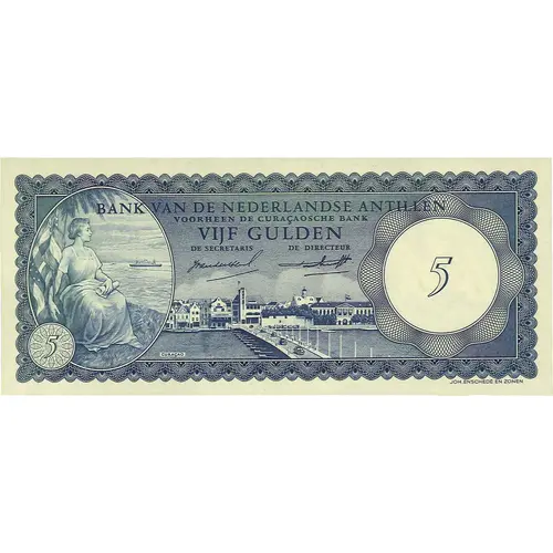 BANK VAN DE NEDERLANDSE ANTILLEN VOORHEEN DE CURAÇAOSCHE BANK VIJF GULDEN De Secretaris De Directeur JOH. ENSCHEDÉ EN ZONEN (Translation: Bank of Netherlands Antilles Former the Bank of Curaçao Five Gulden Secretary Director Joh. Enschedé and Sons) |