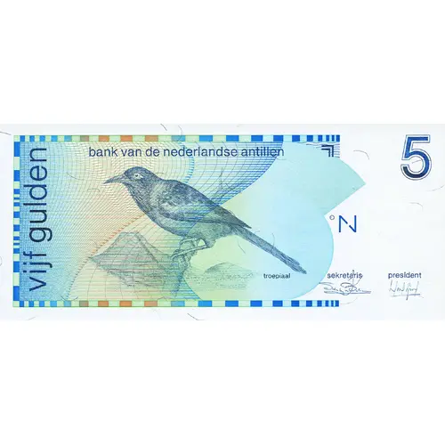 | Legenda do anverso | vijf gulden bank van de nederlandse antillen 5 Troepiaal (Translation: Five Gulden Bank of the Netherlands Antilles 5 Troupial) |