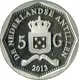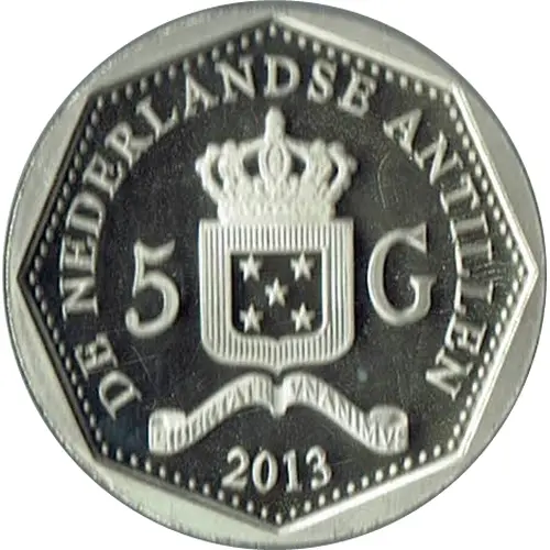 | Obverse lettering | DE NEDERLANDSE ANTILLEN 5 G LIBERTATE UNANIMUS 2013 |