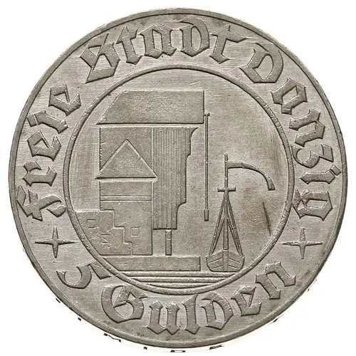 Freie Stadt Danzig + 5 Gulden + (Translation: Free city of Danzig) |