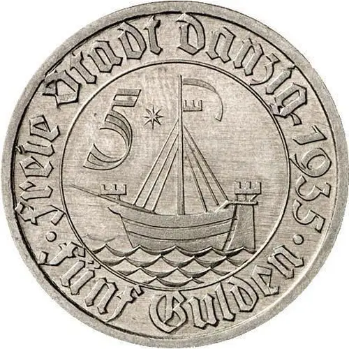 表面の銘文 FREIE STADT DANZIG · 1935 ·FÜNF GULDEN· 5