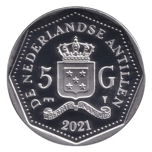 | Obverse lettering | DE NEDERLANDSE ANTILLEN 5 G LIBERTATE UNANIMUS 2021 (Translation: The Netherlands Antilles 5 Guilder Freedom of Mind) |