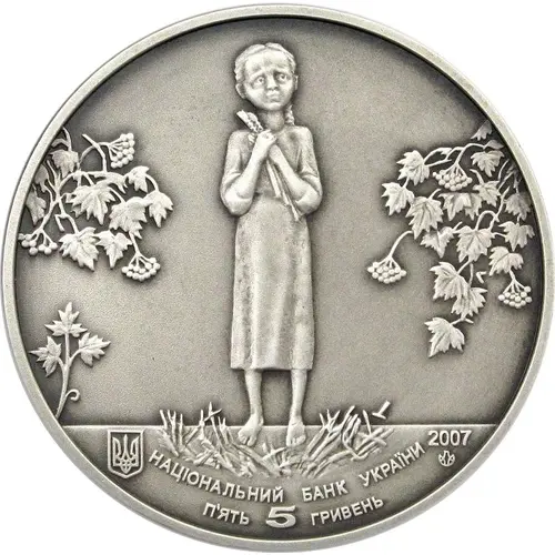 In the center there is the image of a girl with corn gleanings in hands standing in the stubble-field, on her both sides - the viburnum branches. There is the Small National Emblem of Ukraine on the left, the coin issue year: 2007, П`ЯТЬ 5 ГРИВЕНЬ (Five 5 hryvnias), there is the semi-circular legend - НАЦІОНАЛЬНИЙ БАНК УКРАЇНИ (National Bank of Ukraine) - as well as the logotype of the National Bank of Ukraine Mint. |