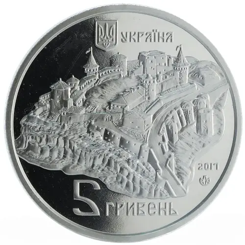 | Obverse description | Above are Ukraine`s small coat of arms and the legend УКРАЇНА (Ukraine); in the center against a smooth background is a layout of the old castle in the town of Kamianets-Podilsk; to the right is the coin issue year - 2017; beneath is the coin face value: 5 ГРИВЕНЬ (5 hryvnias). To the right, is the mint mark of the NBU Banknote Printing and Minting Works. |