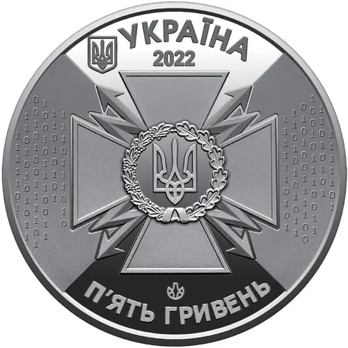 | Obverse description | At the top – the small State Coat of Arms of Ukraine, to the right of which is the inscription УКРАЇНА/2022, in the center, against the background of stylized information in the form of binary code digits – the emblem of the State Service for Special Communications and Information Protection of Ukraine, below the emblem on a mirror in the background - the logo of the Banknote and Mint of the National Bank of Ukraine and the denomination of П’ЯТЬ ГРИВЕНЬ (semicircle). |