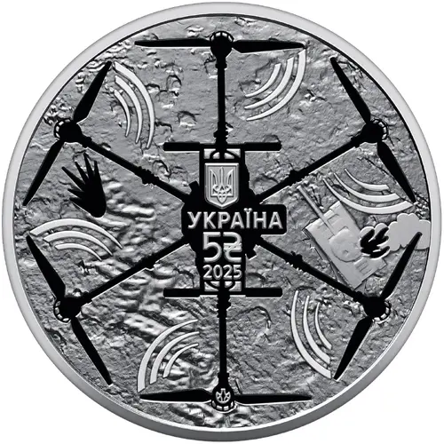 | Obverse description | Mutilated earth surface with characteristic craters is depicted, reflecting the marks of explosive device impacts. In the left part of the composition, defensive trenches are positioned, emphasizing the defensive nature of resistance. To the right, a damaged and burning enemy tank is depicted, symbolizing the successful destruction of enemy equipment. Above this dynamic battlefield scene, the silhouette of a Vampire drone hovers in flight. |