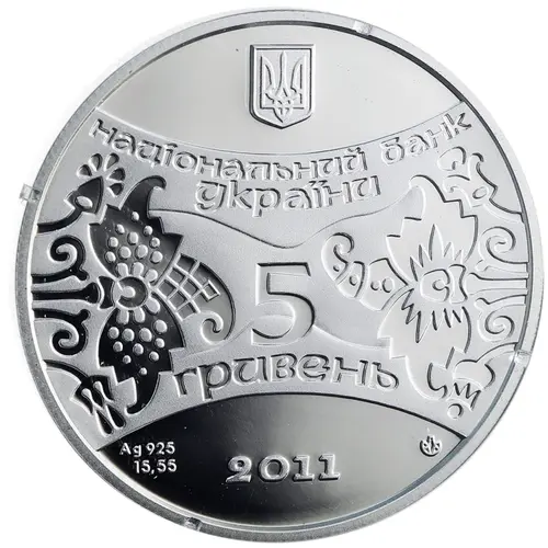 Above there is the Small Coat of Arms of Ukraine with the inscription НАЦІОНАЛЬНИЙ БАНК/ УКРАЇНИ (National Bank/of Ukraine) thereunder; within a conventionalized vegetable ornamentation pattern there is the coin face value 5/ ГРИВЕНЬ (5/ Hryvnias); below there is the coin issue year indication 2011, as well as the indications of the metal and its fineness Ag 925, coin weight in fineness 15,55 g and the National Bank of Ukraine Mint logotype. |