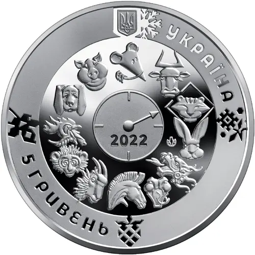 | Obverse description | Above is Ukraine`s small coat of arms, to the right of which is the semicircular legend УКРАЇНА (Ukraine); against a smooth background are the 12 symbols of the oriental calendar depicted around a circle; in the center of the circle is a stylized clock with a hand pointing to the tiger – the symbol of 2022; below the hand is the legend 2022; beneath, to the left, is the semicircular legend 5 ГРИВЕНЬ (5 hryvnias); against a matt background are the symbols of each season that were stylized to resemble a Ukrainian ornament: a snowflake (above), a flower (to the right), a berry (beneath), and a leaf (to the left); the mint mark of the NBU’s Banknote Printing and Minting Works is to the left of the symbol of the rabbit. |