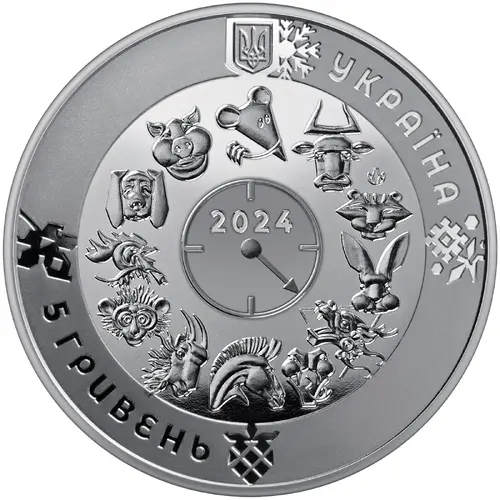 | Obverse description | At the top – a small State Coat of Arms of Ukraine, to the right of which is the inscription УКРАЇНА in a semicircle; 12 symbols of the Eastern calendar are depicted in a circle on a mirror background, in the center of the circle - a stylized clock with an arrow pointing to a dragon - a symbol of the year, under the arrow - 2024; at the bottom left, the inscription in a semicircle 5 ГРИВЕНЬ; on a matte background, the symbols of each season stylized as Ukrainian vytynanka are depicted: a snowflake (above), a flower (right), a berry (below), a leaf (left); logo of the Mint of the National Bank of Ukraine (on the right above the tiger symbol). |