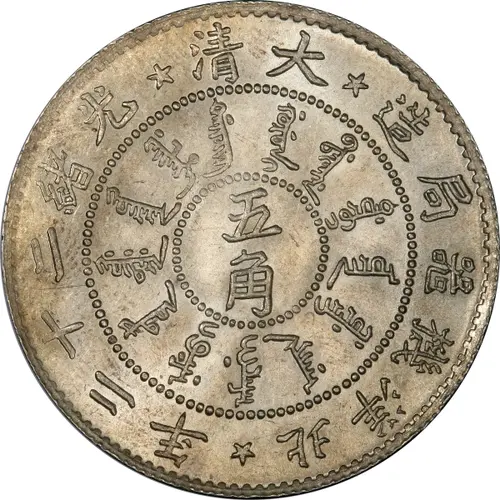 | Obverse lettering | 清大 造局器械洋北 - 年二十二绪光 ᡩᠠᡳᠴᡳᠩ ᡤᡠᡵᡠᠨ ᡳ᠋ ᠪᠠᡩᠠᡵᠠᠩᡤᠠ ᡩᠣᡵᠣ ᡳ᠋ ᠣᡵᡳᠨ ᠵᡠᠸᡝᠴᡳ ᠠᠨᡳᠶᠠ ᠠᠮᠠᡵᡤᡳ ᠨᠠᠮᡠ ᡳ᠋ ᡨᡝᡨᡠᠨ ᡧᡠᡵᡩᡝᡵᡝ ᡴᡡᠸᠠᡵᠠᠨ ᠸᡝᡳᡵᡝᡥᡝ 五 角 (Translation: Great Qing Bei Yang Arsenal Mint / Year 22 of Guangxu Great Qing / Made in Year 22 of Guangxu by the Bei Yang Aresnal Mint 5 Jiao) |
