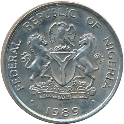 | نوشتههای روی سکه | FEDERAL REPUBLIC OF NIGERIA FUNITY AND FAITH, PEACE AND PROGRESS 1989 |