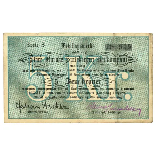 Betalingsmerke utstedt av Store Norske Spitsbergen Kulkompani Aktieselskap Mot dette betalingsmerke, som er utstedt for tilgodehavende løn, utleverer Store Norske Spitsbergen Kulkompani, til ihændehaveren varer for et -beløp av 5 - Fem kroner Ubenyttede betalingsmerker blir ved ihændehaverens avreise fra Spitsbergen i sæsonen 1933/34 at tilbakelevere til kontoret mot beløpets godskrivning i opgjøret. Merket er ugyldig utenfor Spitsbergen og efter sæsonens avslutning. Styrets formand. Kontordjef, Spitsbergen. (Translation: Payment note issued by The Great Norwegian Spitsbergen Coal Company Against this payment note, which is issued for outstanding wages, The Great Norwegian Spitsbergen Coal Company delivers to the bearer goods for an amount of 5 kroner Unused notes when the beares departs from Spitsbergen during the season 1933/34 is returned to the office against credit of the amount in the settlement. The note is invalid outside Spitsbergen and after the end of the season. Chairman of the board. Office manager, Spitsbergen.) |