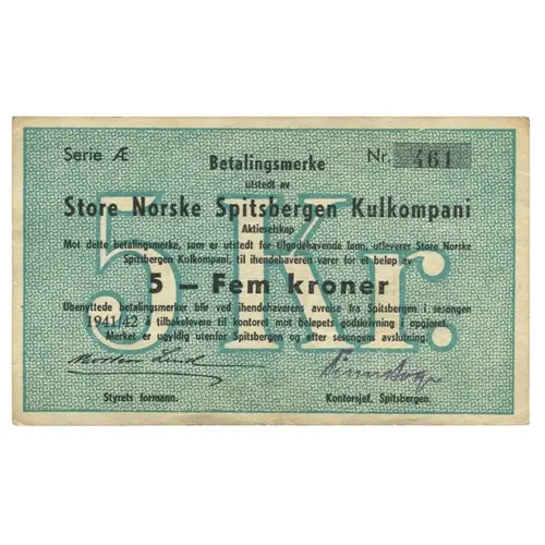 Betalingsmerke utstedt av Store Norske Spitsbergen Kulkompani Aktieselskap Mot dette betalingsmerke, som er utstedt for tilgodehavende lønn, utleverer Store Norske Spitsbergen Kulkompani, til ihendehaveren varer for et beløp av 5 - Fem kroner Ubenyttede betalingsmerker blir ved ihendehaverens avreise fra Spitsbergen i sesongen 1941/42 å tilbakelevere til kontoret mot beløpets godskrivning i opgjøret. Merket er ugyldig utenfor Spitsbergen og efter sesongens avslutning. Styrets formann. Kontorsjef, Spitsbergen. (Translation: Payment note issued by The Great Norwegian Spitsbergen Coal Company Against this payment note, which is issued for outstanding wages, The Great Norwegian Spitsbergen Coal Company delivers to the bearer goods for an amount of 5 kroner Unused notes when the beares departs from Spitsbergen during the season 1941/42 is returned to the office against credit of the amount in the settlement. The note is invalid outside Spitsbergen and after the end of the season. Chairman of the board. Office manager, Spitsbergen.) |