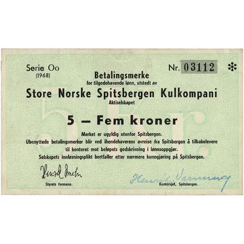 Betalingsmerke for tilgodehavende lønn, utstedt av Store Norske Spitsbergen Kulkompani Aktieselskap 5 - Fem kroner Merket er ugyldig utenfor Spitsbergen. Ubenyttede betalingsmerker blir ved ihendehaverens avreise fra Spitsbergen å tilbakelevere til kontoret mot beløpets godskrivning i lønnsoppgjør. Selskapets innløsningsplikt bortfaller etter nærmere kunngjøring på Spitsbergen. Styrets formann. Kontorsjef, Spitsbergen. (Translation: Payment note issued by The Great Norwegian Spitsbergen Coal Company for due wages 5 kroner The note is invalid outside Spitsbergen. Unused payment notes must be returned upon the holder`s departure from Spitsbergen to the office againt the amount being credited on the payroll. The company`s obligation ceases after further announcement on Spitsbergen. Chairman of the board. Office manager, Spitsbergen.) |