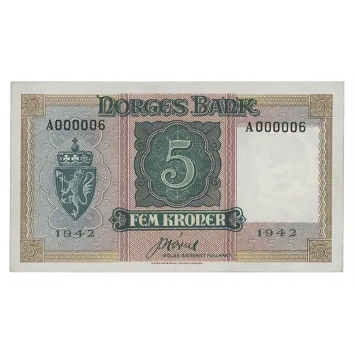 | 正面铭文 | NORGES BANK 5 FEM FEM KRONER 1942 1942 IFÖLGE SÆRSKILT FULLMAKT WATERLOW & SONS LIMITED, LONDON |