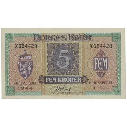 NORGES BANK 5 FEM FEM KRONER KRIGSSEDDEL KRIGSSEDDEL 1944 1944 IFÖLGE SÆRSKILT FULLMAKT WATERLOW & SONS LIMITED, LONDON |