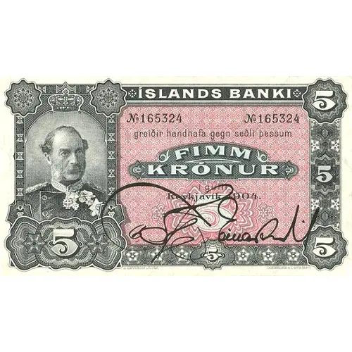 | Obverse lettering | Íslands banki greiðir handhafa gegn seðli þessum fimm krónur i gulli. Reykjavík 1904. (Translation: The Bank of Iceland will pay the bearer against this banknote five krónur in gold. Reykavik, 1904.) |