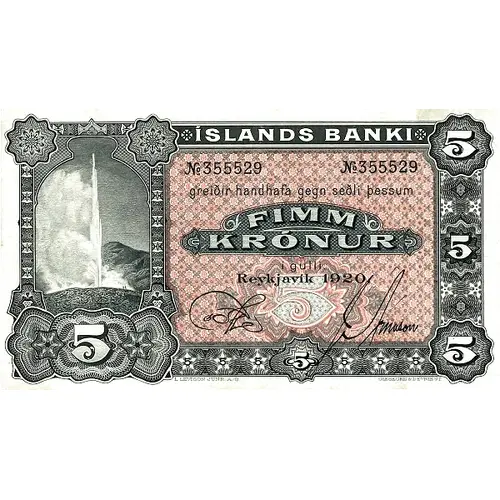 | Obverse lettering | ÍSLANDS BANKI greiðir handhafa gegn seðli þessum FIMM KRÓNUR í gulli Reykjavik 1920 (Translation: The Bank of Iceland will pay the bearer against this banknote five krónur in gold. Reykavik, 1920) |