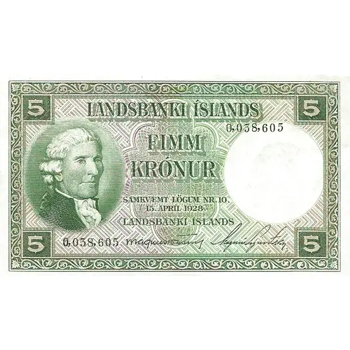 5 LANDSBANKI ÍSLANDS 5 FIMM KRÓNUR SAMKVÆMT LÖGUM NR.10. 15 APRIL 1928 LANDSBANKI ÍSLANDS 5 5 (Translation: National Bank of Iceland Five Kronur According to Law NO.10. April 15, 1928 National Bank of Iceland) |