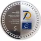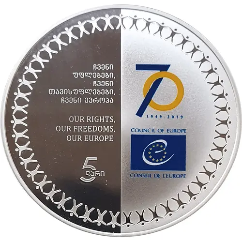 Obverse symmetrically divided into 2 equal parts and encircled by 47 human figures being holding hands, which symbolize the 47 member States of the Council of Europe. The 70th anniversary logo of the Council of Europe is depicted at the right, Georgian and English inscription (same text) at the left side. |