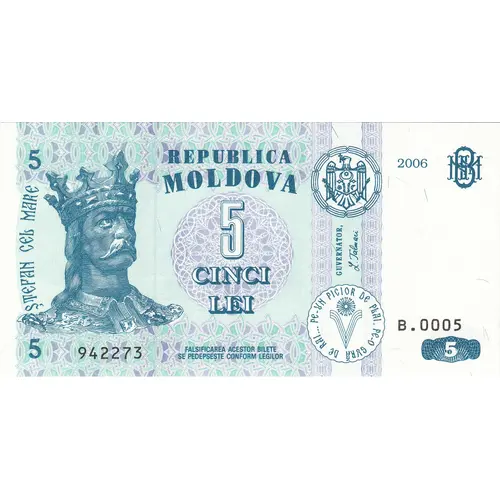 | 表面の銘文 | REPUBLICA MOLDOVA 1994 5 5 CINCI LEI STEFAN CEL MARE GUVERNATOR 5 FALSIFICAREA ACESTOR BILETE SE PEDEPSESTE CONFORM LEGILOR 5 |