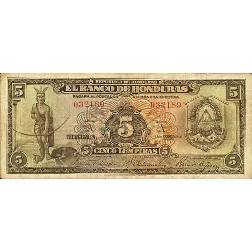 | نوشتههای روی اسکناس | REPÚBLICA DE HONDURAS EL BANCO DE HONDURAS PAGARÁ AL PORTADOR EN MONEDA EFECTIVA 5 SÉRIE A TEGUCIGALPA, 11 DE FEBRERO DE 1932. CINCO LEMPIRAS (Translation: Republic of Honduras The Bank of Honduras Pay to Bearer in currency Series A Tegucigalpa, February 11th., 1932. Five Lempiras) |