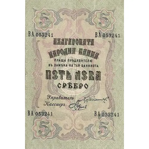 | Obverse lettering | Петъ Лева Срѣбро. Българската Народна Банка Плаща Прѣдявителю въ замѣна на тая банкнота (Translation: Five Leva Silver The Bulgarian National Bank Pays the Bearer for exchange of this banknote) |