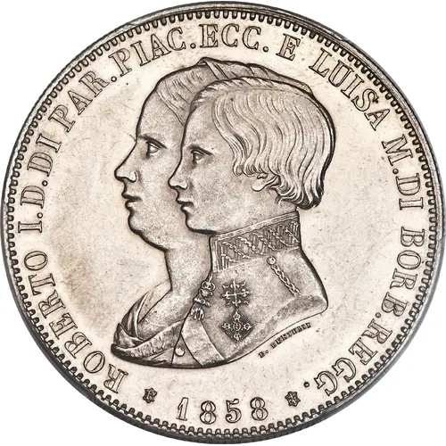 | Obverse lettering | ROBERTO I.D.DI PAR.PIAC.ECC. E. LUISA M.DI BORB. REGG. D· BENTELLI 1858 |