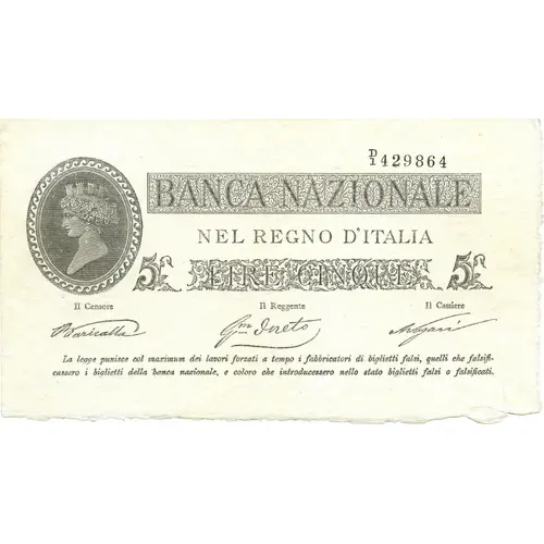 BANCA NAZIONALE NEL REGNO D`ITALIA 5 LIRE CINQUE 5 Il Censore - Il Reggente - Il Cassiere La legge punisce col maximum dei lavori forzati a tempo i fabbricatori di biglietti falsi, quelli che falsificassero i biglietti della banca nazionale, e coloro che introducessero nello stato biglietti falsi o falsificati. (Translation: NATIONAL BANK IN THE KINGDOM OF ITALY 5 LIRE FIVE 5 The Censor - The Regent - The Cashier The law punishes the makers of counterfeit banknotes, those who counterfeit National Bank banknotes, and those who introduce false or falsified banknotes into the State with the maximum of fixed-term forced labor.) |