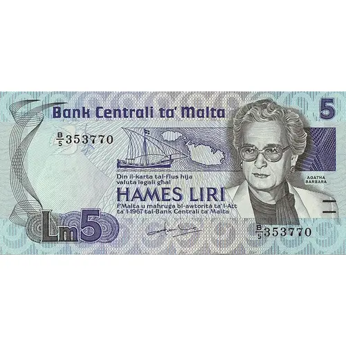 Bank Centrali ta’ Malta Din il-karta tal-flus hija valuta legali għal ĦAMES LIRI f`Malta u maħruġa bl-awtorità ta’ l-Att ta’ l-1967 tal-Bank Centrali ta’ Malta (Translation: Central Bank of Malta This banknote is legal tender for Five Liri in Malta and issued with the authority of the Central Bank of Malta Act of 1967) |