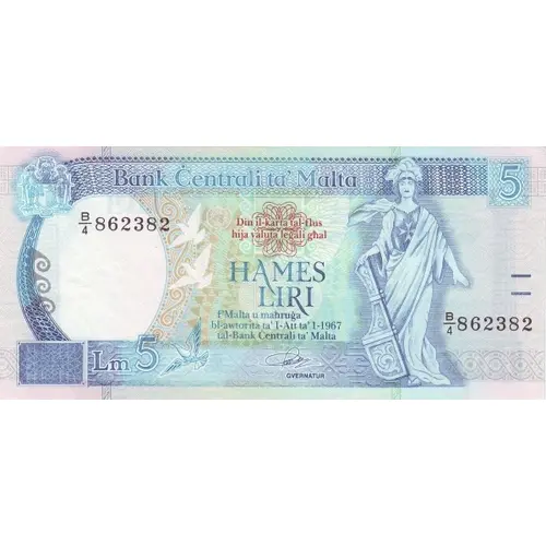 (Translation: Central Bank of Malta This banknote is legal tender for Five Liri in Malta and issued with the authority of the Central Bank of Malta Act of 1967)