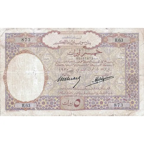 | Reverse lettering | GRAND-LIBAN BANQUE DE SYRIE ET DU GRAND-LIBAN CINQ LIVRES REMBOURSABLE AU PORTEUR EN CHÈQUE SUR PARIS OU MARSEILLE À RAISON DE VINGT FRANCS PAR LIVRE CL. SERVEAU FEC. RITA SC. |
