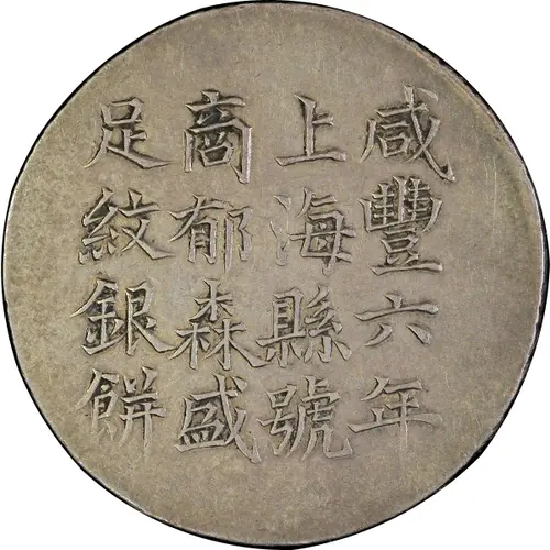| Obverse lettering | 足商上咸 紋郁海豐 銀森縣六 餅盛號年 (Translation: Year 6 of Xianfeng Shanghai District Business firm of Yu Sen-sheng Cake of fine silver) |