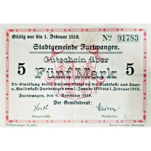 | Obverse lettering | Gültig nur bis 1 Februar 1919.Stadtgemeinde Furtwangen.Gutschein über Fünf Mark.Die Einlösung dieses Scheines Erfolg bei der Stadtkasse u.Waisenkasse Furtwangen Vom 1 Januar 1919 bis 1 Frebruar 1919.Der Gemeinderat. |