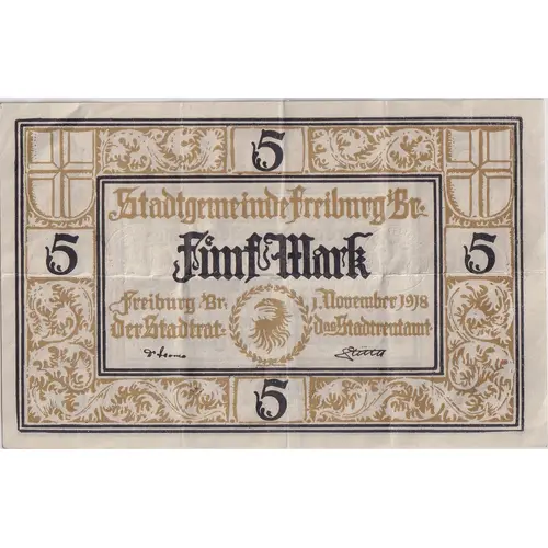 | Obverse lettering | 5 Stadtgemeinde Freiburg i Br. 5 Fünf Mark 5 Freiburg i Br. 1. November 1918 der Stadtrat des ... |