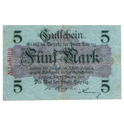 | نوشتههای روی اسکناس | Gutschein Gültig im Bezirke der Stadt Leipzig Fünf Mark zahlen die Kassen der Stadt Leipzig gegen Rückgabe dieses Gutscheines Leipzig, den 17. Oktober 1918 Der Rat der Stadt Leipzig |